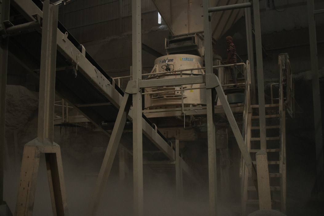 Stone processed through crusher plant to produce cubical particles at precise specifications.